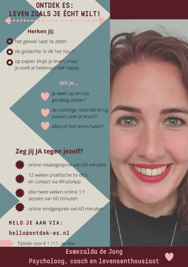 Samen kijken we waar je tegenaan loopt, hoe jij de controle terug krijgt over je leven en maak je de commitment om jezelf op de eerste plek te zetten. Ik sta voor je klaar in 1:1 sessies en in daartussen ga je aan de slag met inspirerende opdrachten die je heel veel inzichten en handvatten gaan geven. Na deze 12 weken heb jij alle tools om écht te leven zoals jij wilt!